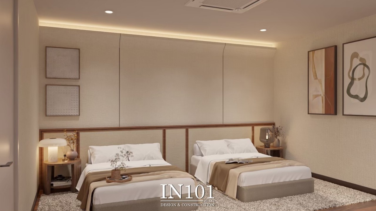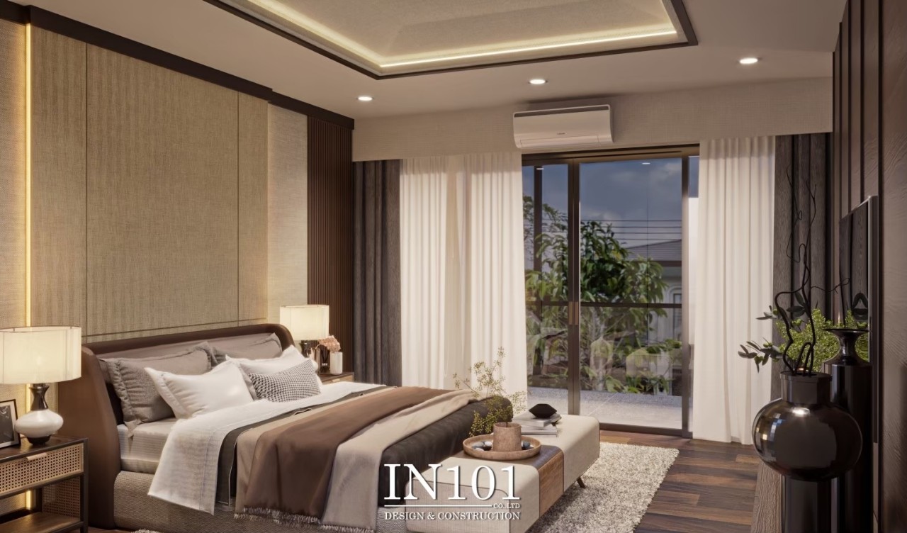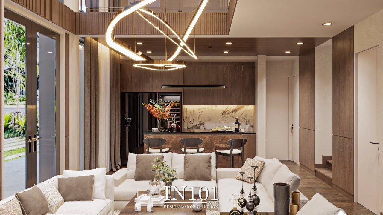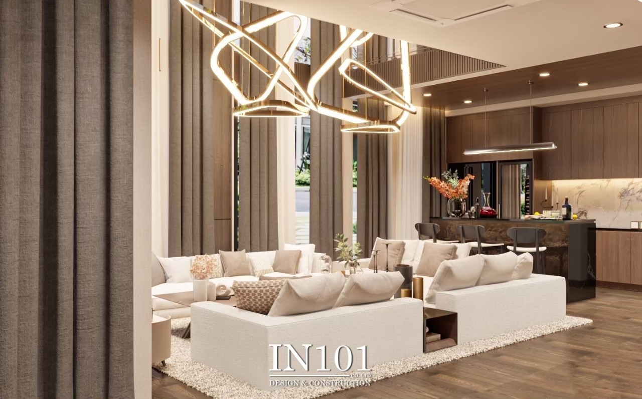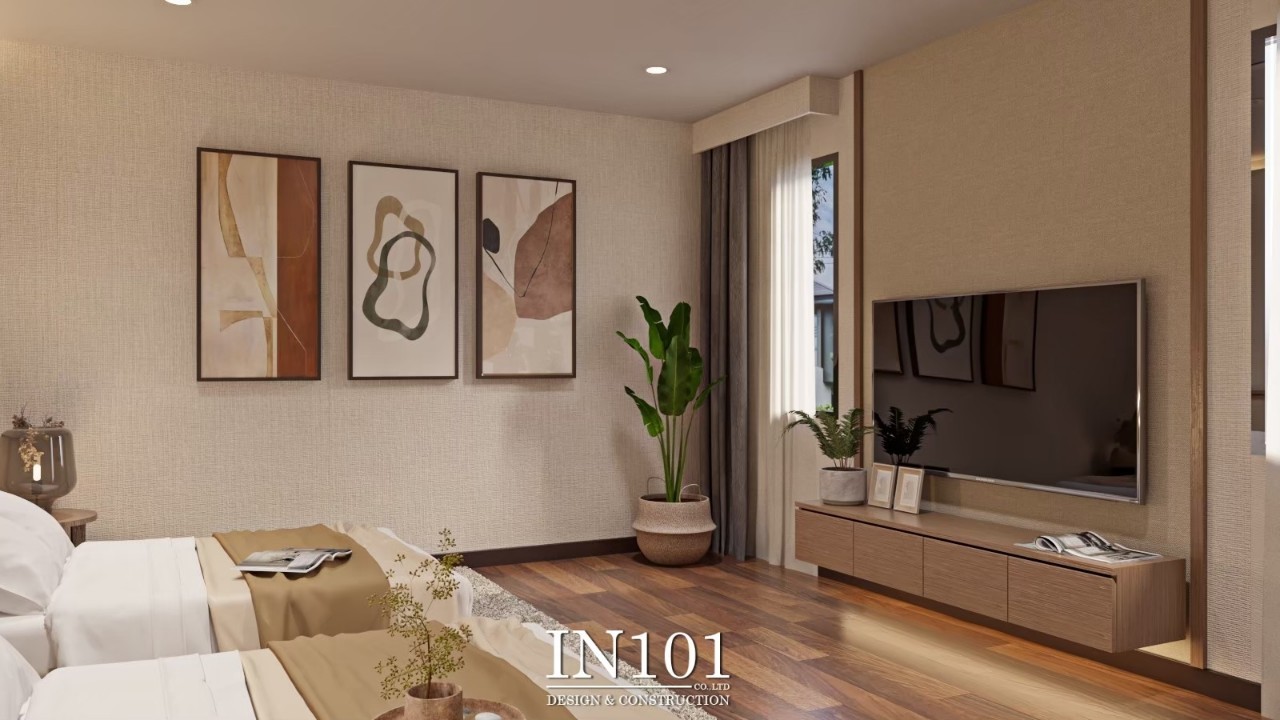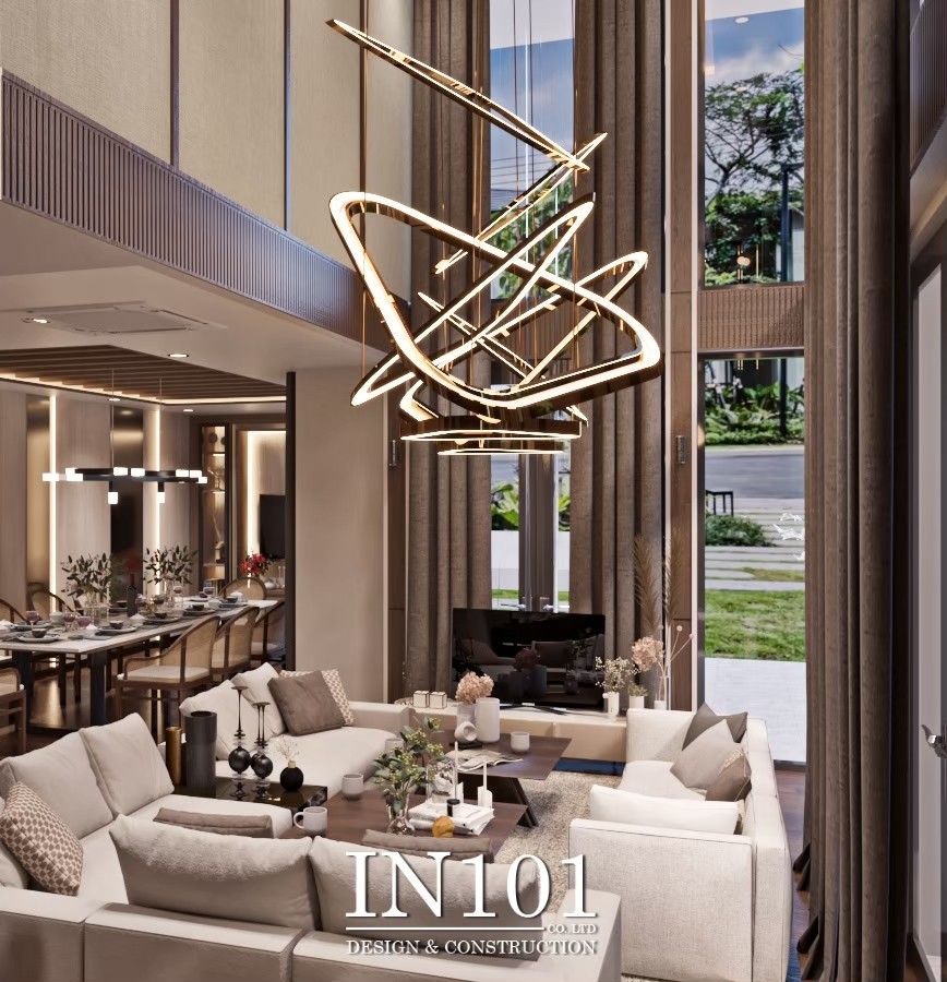 ออกแบบตกแต่งบ้าน Valor รามอินทรา : งานออกแบบในครั้งนี้เป็นบ้านเดี่ยวขนาด 220 ตารางเมตร ทีมงาน IN101Design ได้โจทย์มาจากลูกค้าว่าอยากได้ที่พักในสไตล์ของรีสอร์ท อยากให้เป็นที่อยู่อาศัยไปพร้อมกับที่พักผ่อนในเวลาเดียวกัน งานออกแบบชิ้นนี้จึงออกแบบเน้นไปที่ความสวยงามเป็นหลัก ออกให้ทันสมัยโมเดิร์นมากขึ้น พร้อมกับฟังก์ชั่นการใช้งาน ที่ครบถ้วนเสมือนไปพักที่รีสอร์ทหรู ๆ 5 ดาว จุดเด่นอีกอย่างของบ้านหลังนี้จะเป็นเรื่องห้องนั่งเล่นที่มี Double Volume หรือ ที่เรียกว่าเพดานสูง 2 ชั้นให้ความปลอดโปร่ง อากาศถ่ายเทรู้สึกสบาย